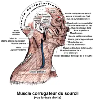 Muscle corrugateur du sourcil (en rouge) ; la partie supéro-interne du muscle orbiculaire de l'œil a été dégagée pour faire apparaître le muscle.