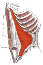 Ce muscle couvre le devant et le côté de l’abdomen, du grand droit de l’abdomen jusqu’au grand dorsal (latissimus dorsi).