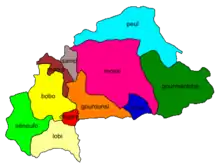 La musique du Burkina Faso comprend la musique folklorique de 60 groupes ethniques différents. Le peuple Mossi, situé au centre, représente 40% de la population tandis qu'au sud, les populations Gurunsi, Gurma, Dagaaba et Lobi, parlant des langues Gur étroitement liées à la langue Mossi, s'étendent dans les États côtiers. Au nord et à l'est les peuls du Sahel prédominent, tandis qu'au sud et à l'ouest les langues mandé sont courantes ; Samo, Bissa, Bobo, Sénoufo et Marka . La musique traditionnelle burkinabé continue de prospérer avec des productions musicales assez diversifiées. La musique populaire est majoritairement en français.