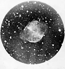 En , William Henry Smyth décrivit M27 comme une nébuleuse à deux têtes ou haltère, sur la poitrine du Renard, près de 14 Vulpeculae se trouvant à environ 7 degrés au sud-est de Beta Cygni et à peu près à mi-chemin entre celle-ci et le Dauphin. Avec son télescope, il observa trois étoiles dans le champ de vision de la nébuleuse. William Huggins a été le premier à réaliser un spectre de M27 à l'aide d'un prisme. Ce spectre contenait trois lignes, dont celle de l'azote. Il a découvert que M27 ne pouvait pas être considéré comme un amas d'étoiles, mais comme une énorme masse de gaz et de vapeur[7]. Un spectre plus détaillé a été réalisé par l'astronome américain Francis Pease en . Une exposition de 32½ heures a produit un spectre montrant quatre lignes à 500,7 nm, 495,9 nm (les raies de l'oxygène doublement ionisé) et deux raies de l'hydrogène (Hβ et Hγ)[7]. La classification sans équivoque comme nébuleuse planétaire ainsi qu'une théorie de la structure de l'enveloppe gazeuse qui explique son apparition ont finalement été réalisées dans les années 1910 par Heber Doust Curtis[8].