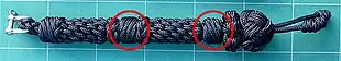 Nœud de ride (entourés en rouge) sur une corde de cloche.