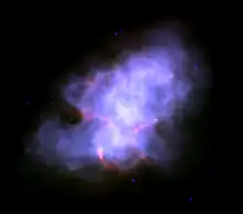 Au centre de la nébuleuse du Crabe se trouve une étoile peu brillante, qui est à l'origine de la nébuleuse. Elle a été identifiée en tant que telle en 1942, lorsque Rudolph Minkowski découvrit que son spectre optique était extrêmement inhabituel et ne ressemblait pas à celui d'une étoile normale[16]. Il a été établi par la suite que la région autour de l'étoile est une source importante d'ondes radio (1949)[17], de rayons X (1963)[18] et qu'elle est un des objets du ciel les plus brillants en rayons gamma (1967)[19]. La densité de flux des émissions X est 100 fois plus grande que celle des émissions en lumière visible[8]. En 1968, des recherches ont montré que l'étoile émettait ses radiations sous forme de brèves impulsions, devenant un des premiers pulsars à être identifié et le premier à avoir été associé à un rémanent de supernova.