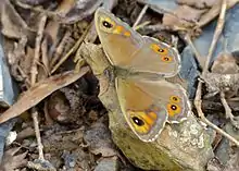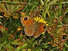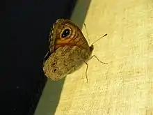 Le verso des antérieures est très marqué de jaune orangé avec l'ocelle noir pupillé de blanc et cerné de jaune à l'apex, alors que les ailes postérieures sont de couleur terne, beige grisé, ornées d'une ligne d'ocelles noirs pupillés de blanc, cerclés successivement de marron clair puis d'une ligne marron.