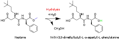 Le néotame s'hydrolyse lentement dans les milieux aqueux, résultant principalement de la formation d’une quantité équimolaire de N-[N-(3,3-diméthylbutyle)-L-α-aspartyl]-L-phénylalanine et de méthanol. Trois autres produits de dégradation sont aussi présents mais ils ne sont pas détectés aux concentrations d'utilisation de l'édulcorant. Par cyclisation se forme le N-[N-(3,3-diméthylbutyle)-L-aspartamidyl]-L-phénylalanine 1-ester méthylique, qui ensuite donne le N-[N-(3,3-diméthylbutyle)-L-aspartamidyl]-L-phénylalanine par hydrolyse, et enfin le N-[N-(3,3-diméthylbutyle)-L-β-aspartyl]-L-phénylalanine 1-ester méthylique qui se forme par réarrangement β du néotame[6].