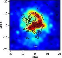 On a détecté à l'aide du télescope spatial Spitzer des raies de l'infrarouge moyen[18], par exemple celle du néon doublement ionisé (Ne ii) à 12,81 μm et du néon triplement ionisé (Ne iii) à 15,55 μm, mais aucune trace d'émission d'hydrocarbures aromatiques polycycliques (HAP). Plusieurs sources radio ont été détectées à des fréquences de 2, 3, 5 et 15 GHz en utilisant le réseau de radiotélescopes VLBA. Ces sources sont alignées dans la direction nord-sud[19].