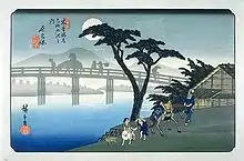 Nagakubo-shuku, estampe de Hiroshige de la série Les Soixante-neuf Stations du Kiso Kaidō. Le titre de l'estampe est Homme à cheval traversant un pont. Il s'agit du pont de Wada sur la rivière Yodo.