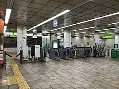 La station dispose de cinq accès équipés d'escaliers et deux ascenseurs pour faire le lien entre la surface et le la billetterie et le contrôle du niveau -1. Pour accéder aux quais elle est équipée d'escaliers, d'escaliers mécaniques et d'ascenseurs faisant le lien entre le niveau -1 et les quais latéraux du niveau -2. La station est accessible aux personnes à la mobilité réduite, y compris la correspondance souterraine avec la gare de Kōsoku Nagata.