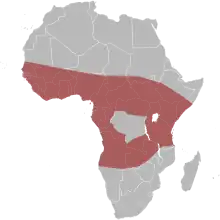 Cette espèce se rencontre en Mauritanie, au Sénégal, en Gambie, en Guinée-Bissau, en Guinée, au Liberia et en Sierra Leone, au Mali, au Burkina, en Côte d'Ivoire, au Ghana, au Togo, au Bénin, au Nigeria, au Niger, au Tchad, au Cameroun, au Gabon, au Congo-Brazzaville, en Centrafrique, au Soudan, en Éthiopie, au Kenya, en Ouganda, au Burundi, en Tanzanie, au Congo-Kinshasa, au Malawi, en Zambie et en Angola[1].