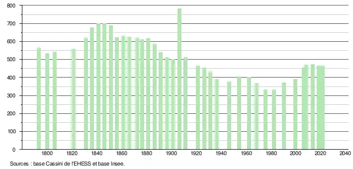 L'évolution du nombre d'habitants est connue à travers les recensements de la population effectués dans la commune depuis 1793. Pour les communes de moins de 10 000 habitants, une enquête de recensement portant sur toute la population est réalisée tous les cinq ans, les populations légales des années intermédiaires étant quant à elles estimées par interpolation ou extrapolation[19]. Pour la commune, le premier recensement exhaustif entrant dans le cadre du nouveau dispositif a été réalisé en 2008[20].