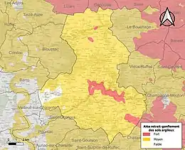 Le retrait-gonflement des sols argileux est susceptible d'engendrer des dommages importants aux bâtiments en cas d’alternance de périodes de sécheresse et de pluie. 96,8 % de la superficie communale est en aléa moyen ou fort (67,4 % au niveau départemental et 48,5 % au niveau national). Sur les 1 037 bâtiments dénombrés sur la commune en 2019, 899 sont en aléa moyen ou fort, soit 87 %, à comparer aux 81 % au niveau départemental et 54 % au niveau national. Une cartographie de l'exposition du territoire national au retrait gonflement des sols argileux est disponible sur le site du BRGM[21],[Carte 3].