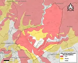Les mouvements de terrains susceptibles de se produire sur la commune sont des tassements différentiels[21]. Le retrait-gonflement des sols argileux est susceptible d'engendrer des dommages importants aux bâtiments en cas d’alternance de périodes de sécheresse et de pluie[22]. 88,2 % de la superficie communale est en aléa moyen ou fort (54,9 % au niveau départemental et 48,5 % au niveau national)[Carte 2]. Depuis le , en application de la loi ELAN, différentes contraintes s'imposent aux vendeurs, maîtres d'ouvrages ou constructeurs de biens situés dans une zone classée en aléa moyen ou fort[Note 3],[23].