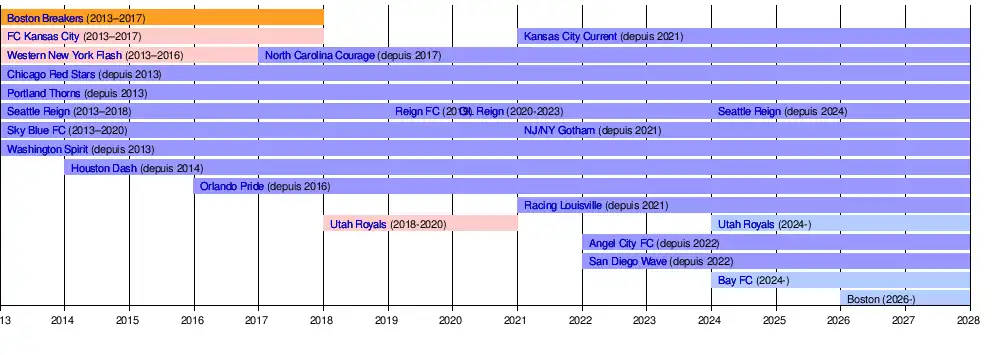 La première saison a lieu en 2013 avec huit équipes, dont quatre anciennes structures du football professionnel féminin (Chicago Red Stars, Boston Breakers, Sky Blue FC (connue depuis 2021 sous le nom NJ/NY Gotham FC), Western New York Flash). Avec l'ajout de trois nouvelles équipes à Houston (2014), Orlando (2016), Salt Lake City (2018) et la perte du FC Kansas City et des Boston Breakers, la ligue compte jusqu'en 2021 neuf équipes à travers les États-Unis. L'arrivée du Racing Louisville, puis de San Diego et du Angel City FC en 2022 porte le nombre d'équipes à 12. Pour la saison 2024, le retour des Utah Royals et la création d'une nouvelle franchise dans la région de la baie de San Francisco, le Bay FC, feront passer le nombre d'équipes à 14[1]. Une quinzième franchise est annoncée à Boston, et débutera en 2026[2]. Depuis la saison inaugurale en 2013, cinq clubs ont été couronnés champions de la NWSL et quatre clubs ont remporté le NWSL Shield, décerné à l'équipe à la première place à la fin de la saison régulière.