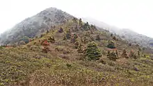 Vue sur le versant nord du Nei Lak Shan composé de conifères qui prennent une teinte rouge au printemps.