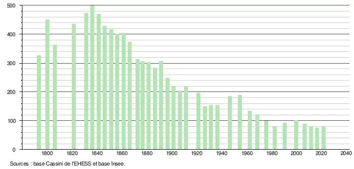 L'évolution du nombre d'habitants est connue à travers les recensements de la population effectués dans la commune depuis 1793. Pour les communes de moins de 10 000 habitants, une enquête de recensement portant sur toute la population est réalisée tous les cinq ans, les populations légales des années intermédiaires étant quant à elles estimées par interpolation ou extrapolation[14]. Pour la commune, le premier recensement exhaustif entrant dans le cadre du nouveau dispositif a été réalisé en 2006[15].