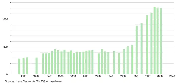L'évolution du nombre d'habitants est connue à travers les recensements de la population effectués dans la commune depuis 1793. Pour les communes de moins de 10 000 habitants, une enquête de recensement portant sur toute la population est réalisée tous les cinq ans, les populations légales des années intermédiaires étant quant à elles estimées par interpolation ou extrapolation[25]. Pour la commune, le premier recensement exhaustif entrant dans le cadre du nouveau dispositif a été réalisé en 2006[26].