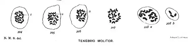 « Du point de vue de la détermination sexuelle, nous avons chez Tenebrio molitor l'espèce la plus intéressante considérée dans ce papier. Dans les cellules somatiques aussi bien que germinales des deux sexes, il y a une différence, non pas du nombre d'éléments chromatiniens, mais de la taille de l'un qui est très petit chez le mâle et de la même grandeur que les 19 autres chez la femelle. Les noyaux des œufs de la femelle doivent être semblables quant au nombre et à la taille des chromosomes, tandis qu'il est absolument certain que les spermatozoïdes se répartissent en deux catégories égales relativement au contenu chromatinien des noyaux. Une moitié d'entre eux ont 9 grands chromosomes et un petit, tandis que l'autre moitié a 10 grands chromosomes.