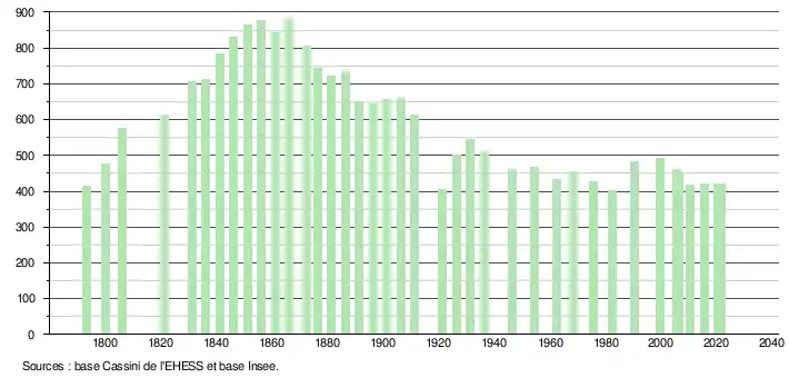 L'évolution du nombre d'habitants est connue à travers les recensements de la population effectués dans la commune depuis 1793. Pour les communes de moins de 10 000 habitants, une enquête de recensement portant sur toute la population est réalisée tous les cinq ans, les populations légales des années intermédiaires étant quant à elles estimées par interpolation ou extrapolation[24]. Pour la commune, le premier recensement exhaustif entrant dans le cadre du nouveau dispositif a été réalisé en 2005[25].