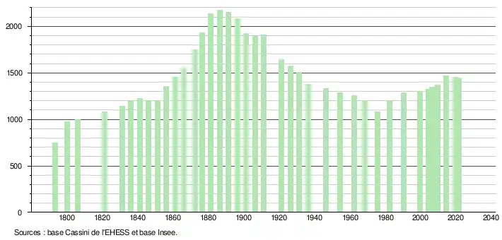 L'évolution du nombre d'habitants est connue à travers les recensements de la population effectués dans la commune depuis 1793. Pour les communes de moins de 10 000 habitants, une enquête de recensement portant sur toute la population est réalisée tous les cinq ans, les populations légales des années intermédiaires étant quant à elles estimées par interpolation ou extrapolation[19]. Pour la commune, le premier recensement exhaustif entrant dans le cadre du nouveau dispositif a été réalisé en 2004[20].