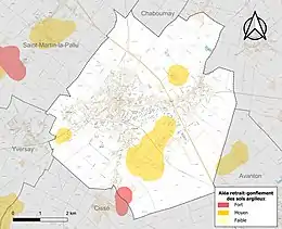 Les mouvements de terrains susceptibles de se produire sur la commune sont des affaissements et effondrements liés aux cavités souterraines (hors mines) et des tassements différentiels[19]. Afin de mieux appréhender le risque d’affaissement de terrain, un inventaire national permet de localiser les éventuelles cavités souterraines sur la commune[20]. Le retrait-gonflement des sols argileux est susceptible d'engendrer des dommages importants aux bâtiments en cas d’alternance de périodes de sécheresse et de pluie[21]. 9,7 % de la superficie communale est en aléa moyen ou fort (79,5 % au niveau départemental et 48,5 % au niveau national)[Carte 2]. Depuis le , en application de la loi ÉLAN, différentes contraintes s'imposent aux vendeurs, maîtres d'ouvrages ou constructeurs de biens situés dans une zone classée en aléa moyen ou fort[Note 6],[22].