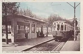 ![]() Le Train bleu du Val de Saône à son terminus de Neuville, dans les années 1930. La ligne a fonctionné jusqu'en 1957, date à laquelle le tramway fut remplacé par l'actuelle ligne 40 des bus lyonnais. |