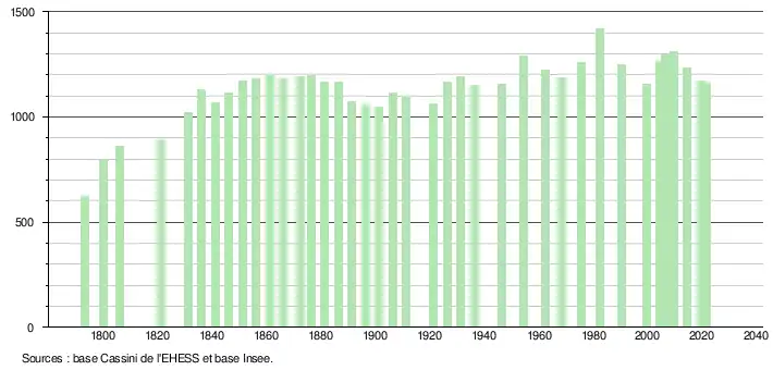 L'évolution du nombre d'habitants est connue à travers les recensements de la population effectués dans la commune depuis 1793. Pour les communes de moins de 10 000 habitants, une enquête de recensement portant sur toute la population est réalisée tous les cinq ans, les populations légales des années intermédiaires étant quant à elles estimées par interpolation ou extrapolation[35]. Pour la commune, le premier recensement exhaustif entrant dans le cadre du nouveau dispositif a été réalisé en 2004[36].