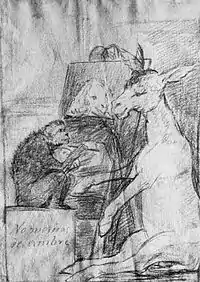Le dessin préparatoire est à la sanguine. Sur le piédestal dessous le singe, Goya a écrit No moriras / de ambre (Tu ne mourras pas de faim). Dans le coin supérieur droit, au crayon est écrit 56. Dans le coin inférieur gauche, au crayon est écrit 26. Le dessin préparatoire mesure 205 × 146 mm.