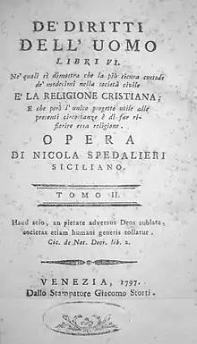 Nicola Spedalieri naquit le à Bronte, en Sicile, fut élevé dans le séminaire de Monreale, où il apprit la théologie sous l’archevêque Francesco Testa de Palerme. Quelques opinions répandues dans une thèse qu’il soutint pour entrer dans les ordres, attirèrent sur lui la censure de ses supérieurs, et il dut se soumettre à la révision de la Chambre apostolique. Le P. Ricchieri, que le pape avait chargé de cet examen, présenta un rapport favorable à l’auteur, qui fut invité de se rendre à Rome. C’était le moment où les ouvrages philosophiques faisaient le plus de bruit en Europe. Voulant mettre d’accord la philosophie avec la religion, Spedalieri rapprocha l’une de l’autre et crut prouver que les droits de l'homme, tels qu’on venait de les proclamer en France, étaient tous établis dans l’Évangile, dont les dogmes lui paraissaient plus que suffisants pour fonder la société sur les bases de l’égalité et de la justice. Dans cet ouvrage, Spedalieri aborda les questions les plus délicates et ne recula pas même devant la théorie du régicide, qu’il essaya de justifier par la doctrine de Thomas d'Aquin. Seulement, il n’accordait le droit de détrôner un tyran qu’à la dernière extrémité, avec les plus fortes restrictions, et sans déguiser aucun des dangers auxquels on reste exposé après un remède aussi violent. Du reste, dans le cours de ce traité, l’auteur se livre à de longs développements pour prouver que les idées religieuses sont l’appui le plus ferme des corps politiques ; que la religion révélée est la seule capable de fixer la destinée et le bonheur d’un peuple, et que le moyen le plus puissant pour arrêter les progrès de la révolution était de relever le trône et l’autel. Cet ouvrage ne satisfit ni les orthodoxes ni les philosophes. Spedalieri en attendant recevait les félicitations des universités de Padoue et de Pavie, tandis que son livre, repoussé de la plupart des États italiens, lui avait suscité une foule de contradicteurs. Les auteurs du journal ecclésiastique de Rome, le P. Tamagna, professeur au Collège de la Sapience, l’abbé Bianchi, un anonyme et le P. Toni, clerc régulier, l’attaquèrent vivement dans leurs écrits. Ce dernier, qui avait emprunté le nom de son imprimeur (Salomoni), s’attacha surtout à démontrer que le troisième livre de l’opuscule De regimine principum, imprimé parmi les œuvres de Thomas d'Aquin, et auquel Spedalieri s’en était rapporté pour autoriser le tyrannicide, ne doit pas être attribué à ce saint docteur, comme Bellarmin et le P. Labbe l’ont cru. Spedalieri, assailli par tant d’ennemis, aurait succombé, si ses protecteurs n’avaient fait valoir les services qu’il avait rendus à la religion par ses réfutations de Fréret et de Gibbon. Par ce moyen il obtint un bénéfice à la Basilique vaticane, malgré la constitution de Léon X, qui prescrivait de n’accorder cette faveur qu’à des Romains. Spedalieri mourut à Rome, le .