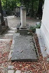 Le , à l'âge de soixante-dix-sept ans, Neufchâteau meurt de la goutte, une maladie dont il est atteint depuis longtemps[69] et qui le cloue dans un fauteuil depuis déjà plusieurs années. Il repose au cimetière du Père-Lachaise, dans la tombe correspondant à la concession no 28-1828,[réf. nécessaire] XIe division, 2e ligne. Surmontant une simple dalle, une colonne d'un mètre de haut porte l'inscription : françois / de neufchateau / décédé le / 10 janvier 1828 / a l'age de / 77 ans / regrets éternels / de tous ses amis[70].