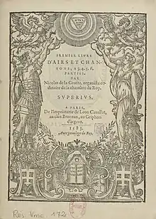 - Premier livre d'airs et chansons à 3, 4, 5, 6 parties, par Nicolas de La Grotte organiste ordinaire de la Chambre du Roy. - Paris : Léon Cavellat, 1583.