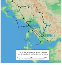 À la différence des autres fondations romaines en Grèce contemporaines de Nicopolis, telles Patras, Philippes, et en Épire même, Buthrote et Dyrrachium, la ville n'est pas — ou du moins pas seulement — une colonie romaine mais une cité libre, la civitas libera Nicopolitana, autrement dit une polis (une cité grecque)[5], libre et autonome, liée à Rome par un traité (foedus) : sa création procède du synœcisme des cités voisines d'Épire et d'Étolie-Acarnanie, dont les populations sont déplacées pour venir peupler, probablement avec des colons et des vétérans de l'armée romaine, la nouvelle ville. L'originalité de l'opération, outre le fait que l'autorité romaine en soit l'instigatrice, tient en la très vaste zone concernée, et au nombre important de cités participantes : les sources mentionnent ainsi Cassopée, Ambracie, Anactorion, Alyxia, Argos Amphilochique, Thyrion, Oinéa, Palairos, Leucade et Calydon d'Étolie[6]. Le territoire (chôra) de Nicopolis s'étend ainsi des rives de l'Achéloos à l'est, à l'île de Leucade comprise, au sud-ouest, du Thyamis au nord, au golfe de Patras au sud, et comprend l'essentiel des régions antiques de Thesprotie, Amphilochie, Dryopis et Acarnanie.
