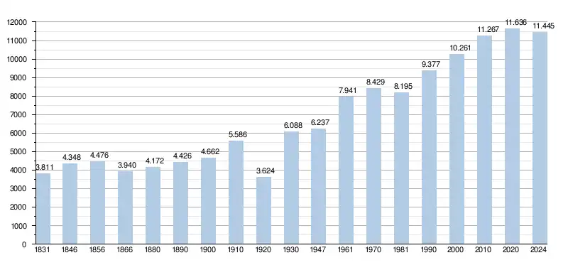 Elle comptait, au , 11 430 habitants (5 591 hommes et 5 839 femmes), soit une densité de 343,45 habitants/km²[10] pour une superficie de 33,28 km².