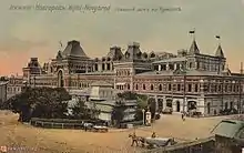 La ville accueille l'exposition russe de l'industrie et du commerce (en) en 1896[12]. À l'occasion de cet événement, la première ligne de tramway de la ville est construite. C'est le second tramway construit dans tout l'Empire russe. Le premier radio-récepteur au monde y est également présenté par l'ingénieur Popov, ainsi que d'autres avancées technologiques. Les constructions innovatrices et exquises de Vladimir Choukhov honorent toujours beaucoup de villes à travers l'ancien Empire russe. Choukhov conçoit huit pavillons d'exposition recouverts d'un treillis de coquilles (application de technique de couvertures pré-tendues, sous forme de structures de coquille mince) pour la foire de Nijni Novgorod de 1896, couvrant une superficie de 27 000 km2 et comportant une tour hyperboloïde.