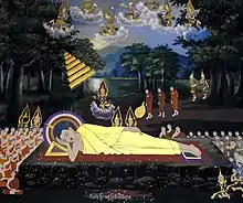 Peinture murale traditionnelle khmère représentant le Bouddha entré dans le parinirvâna. Wat Botum Vathey, Phnom Penh, Cambodge.