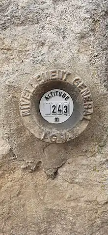 - sur la façade de l'église de Varennes-sur-Allier (Allier), deux repères voisins indiquent l'un 251,36 m et l'autre (plus récent) 248,46 m.