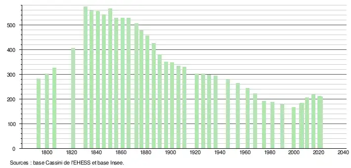 L'évolution du nombre d'habitants est connue à travers les recensements de la population effectués dans la commune depuis 1793. Pour les communes de moins de 10 000 habitants, une enquête de recensement portant sur toute la population est réalisée tous les cinq ans, les populations légales des années intermédiaires étant quant à elles estimées par interpolation ou extrapolation[30]. Pour la commune, le premier recensement exhaustif entrant dans le cadre du nouveau dispositif a été réalisé en 2005[31].