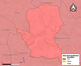 La commune est vulnérable au risque de mouvements de terrains constitué principalement du retrait-gonflement des sols argileux[24]. Cet aléa est susceptible d'engendrer des dommages importants aux bâtiments en cas d’alternance de périodes de sécheresse et de pluie. La totalité de la commune est en aléa moyen ou fort (76,3 % au niveau départemental et 48,5 % au niveau national). Sur les 128 bâtiments dénombrés sur la commune en 2019, 128 sont en aléa moyen ou fort, soit 100 %, à comparer aux 90 % au niveau départemental et 54 % au niveau national. Une cartographie de l'exposition du territoire national au retrait gonflement des sols argileux est disponible sur le site du BRGM[25],[Carte 3].