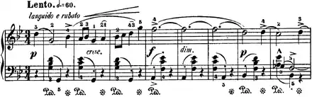 La partie de la main droite est composée de motifs simples de croches et de noires, suivis d'une montée et d'une descente chromatique. La partie de la main gauche conserve des motifs de noires pour soutenir la main droite, avec des marques de pédale toutes les six notes. La partie finale de la pièce est intitulée Religioso faisant jouer à la main droite, à partir de la quatre-vingt neuvième mesure, une série d'accords en legato.