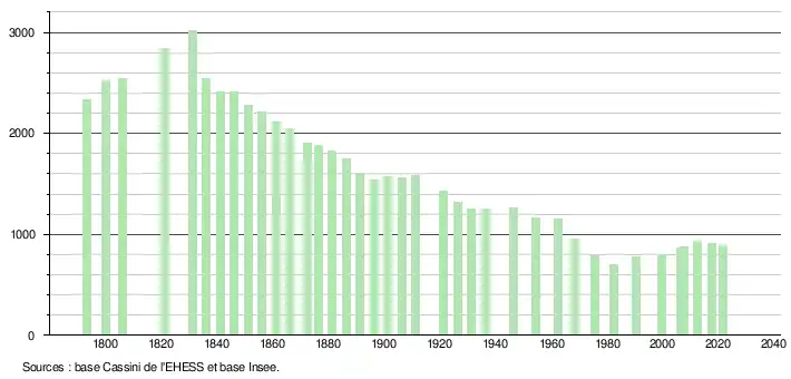 L'évolution du nombre d'habitants est connue à travers les recensements de la population effectués dans la commune depuis 1793. Pour les communes de moins de 10 000 habitants, une enquête de recensement portant sur toute la population est réalisée tous les cinq ans, les populations légales des années intermédiaires étant quant à elles estimées par interpolation ou extrapolation[24]. Pour la commune, le premier recensement exhaustif entrant dans le cadre du nouveau dispositif a été réalisé en 2007[25].