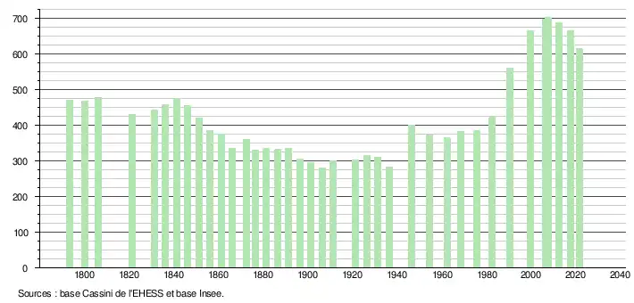L'évolution du nombre d'habitants est connue à travers les recensements de la population effectués dans la commune depuis 1793. Pour les communes de moins de 10 000 habitants, une enquête de recensement portant sur toute la population est réalisée tous les cinq ans, les populations légales des années intermédiaires étant quant à elles estimées par interpolation ou extrapolation[30]. Pour la commune, le premier recensement exhaustif entrant dans le cadre du nouveau dispositif a été réalisé en 2007[31].