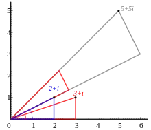 Considérons 2+3i. Multiplier par 2 ce nombre consiste à doubler le vecteur partant de l'origine finissant au point d’abscisse 2 et d'ordonnée 3. On obtient le nombre complexe 4+6i. Bref, multiplier par un nombre réel revient à allonger/rétrécir/changer de sens le vecteur associé au point. Multiplier par un nombre complexe est plus subtil. Cela revient non seulement à allonger/rétrécir le vecteur mais aussi à le pivoter, en additionnant les angles[pas clair]. Plus précisément, pour chaque nombre complexe (i.e. un point du plan), on considère l'angle entre l'axe des abscisses et le vecteur correspondant à la flèche partant de l'origine finissant en ce point. L'exemple ci-dessous considère deux nombres complexes. L'un est obtenu en avançant d'une distance de 2 avec un angle de 30°, et l'autre en avançant de 3 avec un angle de 20°. Le produit de ces deux nombres est le point obtenu en avançant de 6 (2 fois 3) avec un angle de 50° (20° + 30°).