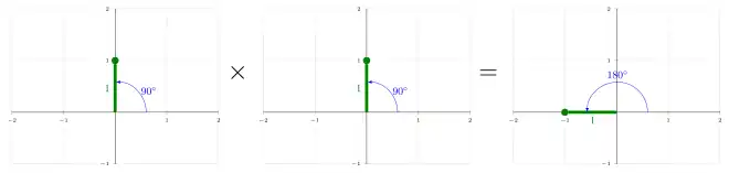 Le nombre i2 vaut i×i : on multiplie i par i. Le nombre i correspond au point d’abscisse nulle et d'ordonnée 1. On remarque un angle de 90° entre l'axe des abscisses et le vecteur correspondant au nombre i (c'est l'angle entre l'axe des abscisses et des ordonnées). Faire la multiplication de i par i revient à additionner les angles : 90° + 90° = 180°. On se trouve donc dans l'autre sens sur l'axe des abscisses et on obtient le point d’abscisse −1 et d'ordonnée 0, qui n'est autre que la représentation du nombre −1.