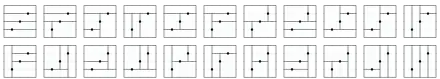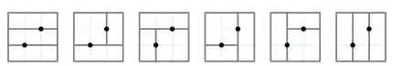 Le n-ème nombre de Schröder compte aussi le nombre de subdivisions d'un rectangle en n + 1 rectangles plus petits obtenu par n droites horizontales ou verticales, avec la restriction qu'il y a n points à l'intérieur du rectangle qui ne sont alignés ni horizontalement ni verticalement, et que toute droite coupante passe par un des points et ne divise qu'un seul rectangle en deux. Sur la figure ci-dessous figurent les 6 subdivisions rectangulaires (rectangulations) en 3 rectangles avec 2 droites coupantes[3].