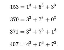 - Un nombre d'Armstrong[3] de quatrième espèce, ou perfect digit invariant (PDI) est un entier n qui est égal à la somme des puissances q-ièmes de ses chiffres, mais cette fois pour un entier q > 0 quelconque, non nécessairement égal au nombre p de chiffres de n (un tel n n'est donc généralement pas un nombre narcissique) : pour un certain q > 0.Intuitivement, il est clair que si p est le nombre exact de chiffres de n et augmente, q tend à augmenter.