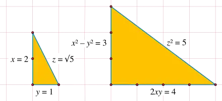 Le nombre premier pythagoricien 5 et sa racine carrée sont tous deux les hypoténuses d'un triangle rectangle à cathètes entières. Les formules montrent comment transformer tout triangle rectangle à cathètes entières d'hypoténuse z en un triangle rectangle à cathètes entières d'hypoténuse z2.