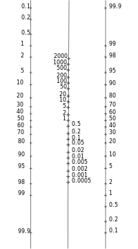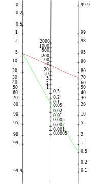 Si on gradue la première échelle en - logit (c'est-à-dire la graduation x est à une ordonnée -logit(x)) et la dernière échelle en logit ((i.e. la graduation x est à une ordonnée logit(x)), le segment joignant Pr et P+ a son milieu sur l'échelle centrale et son ordonnée est alors de