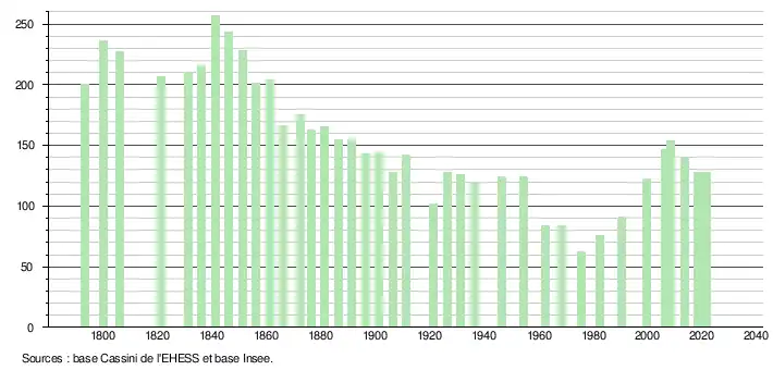 L'évolution du nombre d'habitants est connue à travers les recensements de la population effectués dans la commune depuis 1793. Pour les communes de moins de 10 000 habitants, une enquête de recensement portant sur toute la population est réalisée tous les cinq ans, les populations légales des années intermédiaires étant quant à elles estimées par interpolation ou extrapolation[20]. Pour la commune, le premier recensement exhaustif entrant dans le cadre du nouveau dispositif a été réalisé en 2008[21].