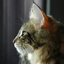 Les oreilles sont grandes, larges à la base et placées dans le prolongement du triangle formé par la tête. Elles peuvent se terminer par une touffe de poils à la manière des oreilles du lynx, qui est appréciée sans être obligatoire. Des oreilles trop petites ou trop rapprochées sont considérées comme un défaut pénalisant (mais cependant pas éliminatoire)[11].