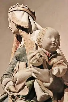 Elle porte sur une robe bleue, ajustée sur le haut du corps, un manteau blanc/gris au revers doré qui lui sert de voile, traité de manière naturaliste car la couleur cherchait à imiter le vair. Les motifs étoilés de sa robe ont disparu avec le temps. Dans quelques parties peu visibles de la bordure et de la doublure du manteau, la dorure a été remplacée par un alliage argent/or recouvert d'un glacis jaune, qui correspond à un souci d'économie selon une technique connue en Allemagne à la fin du Moyen Âge. L’or du galon supérieur de la robe, ainsi que sa couronne, devaient être rehaussés de perles ou de pierres du fait des percements réguliers que l’on peut y constater. Or, il n’y a aucune trace d’usure ou de frottement dû à la présence d’une pierre décorative quelconque. Aucun fragment d’un de ces matériaux ou même de rouille n’a été retrouvé pour le prouver ni aucune trace de colle. Pour l’encolure de la robe, il semblerait donc qu’il n’y ait jamais eu d’ornements. En revanche, pour la couronne, il y a tout de même l’hypothèse qu’un diadème était ajouté autour et attaché, les pierres venant s’insérer dans les trous sans y être bloquées.