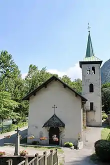 Notre-Dame-de-Briançon depuis le château de Briançon. En arrière-plan, le viaduc du Champ-du-Comte | |