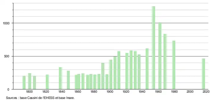 L'évolution du nombre d'habitants est connue à travers les recensements de la population effectués dans la commune depuis 1793. Pour les communes de moins de 10 000 habitants, une enquête de recensement portant sur toute la population est réalisée tous les cinq ans, les populations légales des années intermédiaires étant quant à elles estimées par interpolation ou extrapolation[17]. Pour la commune, le premier recensement exhaustif entrant dans le cadre du nouveau dispositif a été réalisé en 2008[18].